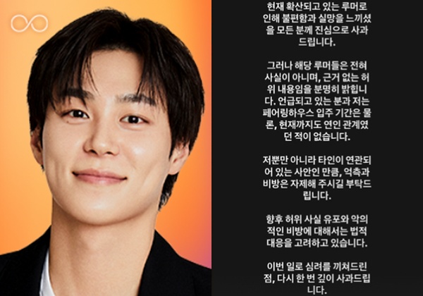 ä³ÎA ¿¬¾Ö ¿¹´É 'ÇÏÆ®Æä¾î¸µ'¿¡ Ã⿬ ÁßÀÎ ÀÌ»óÀ±Àº 21ÀÏ ÀÚ½ÅÀÇ SNS¿¡ "ÇöÀç È®»êµÇ°í ÀÖ´Â ·ç¸Ó·Î ÀÎÇØ ºÒÆíÇÔ°ú ½Ç¸ÁÀ» ´À³¢¼ÌÀ» ¸ðµç ºÐ²² Áø½ÉÀ¸·Î »ç°úµå¸°´Ù. ±×·¯³ª ÇØ´ç ·ç¸ÓµéÀº ÀüÇô »ç½ÇÀÌ ¾Æ´Ï¸ç, ±Ù°Å ¾ø´Â ÇãÀ§ ³»¿ëÀÓÀ» ºÐ¸íÈ÷ ¹àÈù´Ù"°í ±ÛÀ» ¿Ã·È´Ù.