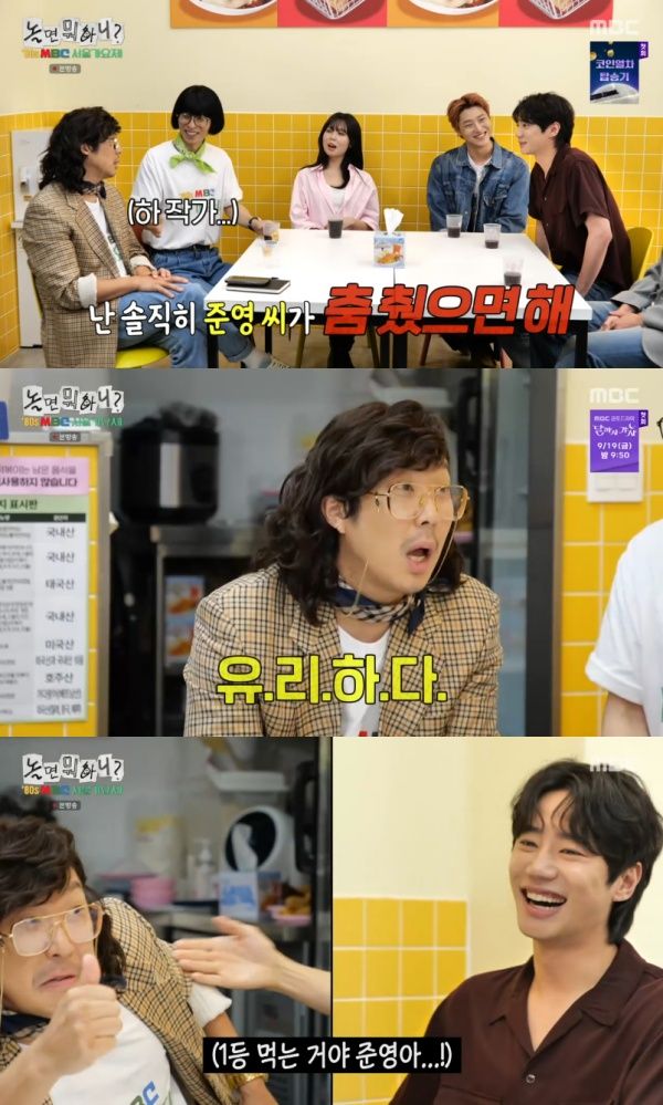 À̳¯ MC À¯Àç¼®°ú ÇÏÇÏ´Â °¡¼ö ÃÖÀ¯¸®¿Í ¿ìÁî, ±×·ì À¯Å°½º Ãâ½Å ¹è¿ì ÀÌÁØ¿µ, Àܳªºñ ÃÖÁ¤Èưú ÇÔ²² °î¿¡ ´ëÇØ ÀdzíÇß´Ù. ÇÏÇÏ´Â ÀÌÁØ¿µ¿¡°Ô ¹Ú³²Á¤ÀÇ '³Î ±×¸®¸ç'¸¦ Á¦¾È, "³ ¼ÖÁ÷È÷ ÁØ¿µ ¾¾°¡ ÃãÃèÀ¸¸é ÁÁ°Ú´Ù"¸ç Àº±ÙÈ÷ °¿äÇß´Ù.