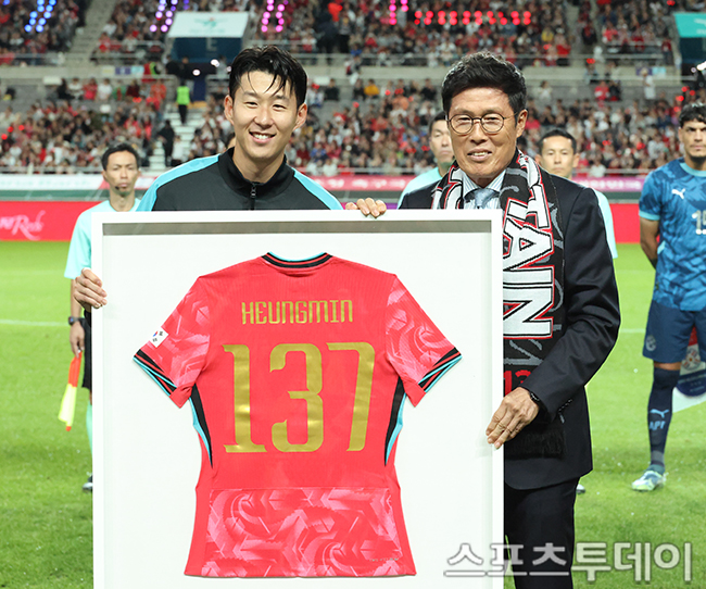 [½ºÆ÷Ã÷Åõµ¥ÀÌ ÆØÇöÁØ ±âÀÚ] 14ÀÏ ¼¿ï¿ùµåÄŰæ±âÀå¿¡¼ ¿¸° Ã౸ ±¹°¡´ëÇ¥ÆÀ Çѱ¹°ú ÆÄ¶ó°úÀÌÀÇ Ä£¼±°æ±â, ĸƾ ¼ÕÈï¹ÎÀÇ 137°æ±â ÃÖ´ÙÃâÀü ±â³ä½ÄÀÌ ¿¸®°í ÀÖ´Ù. »çÁø ¿À¸¥ÂÊÀº Ã౸·¹Àüµå Â÷¹ü±Ù. 2025.10.14.