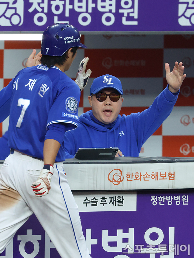 [´ëÀü=½ºÆ÷Ã÷Åõµ¥ÀÌ ÆØÇöÁØ ±âÀÚ] 18ÀÏ ´ëÀüÇÑÈ­»ý¸íº¼ÆÄÅ©¿¡¼­ ¿­¸° 2025 KBO¸®±× Æ÷½ºÆ®½ÃÁð Ç÷¹ÀÌ¿ÀÇÁ »ï¼º ¶óÀÌ¿ÂÁî¿Í ÇÑÈ­ À̱۽ºÀÇ 1Â÷Àü, 9ȸÃÊ »ï¼º ¼±µÎŸÀÚ ÀÌÀçÇöÀÌ È¨·±À» ³¯¸®°í ÀÖ´Ù. ȯȣÇÏ´Â ¹ÚÁø¸¸ °¨µ¶. 2025.10.18.