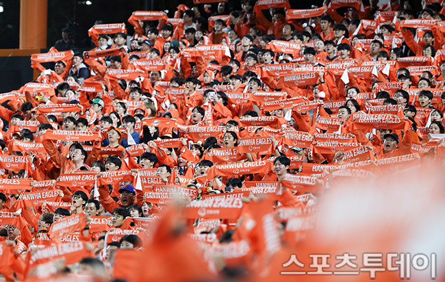 [´ëÀü=½ºÆ÷Ã÷Åõµ¥ÀÌ ÆØÇöÁØ ±âÀÚ] 24ÀÏ ´ëÀüÇÑÈ­»ý¸íº¼ÆÄÅ©¿¡¼­ ¿­¸° 2025 KBO¸®±× Æ÷½ºÆ®½ÃÁð »ï¼º ¶óÀÌ¿ÂÁî¿Í ÇÑÈ­ À̱۽ºÀÇ Ç÷¹ÀÌ¿ÀÇÁ 5Â÷Àü, ÇÑÈ­ ÆÒµéÀÌ °¡À»¾ß±¸¸¦ Áñ±â°í ÀÖ´Ù. 2025.10.24.