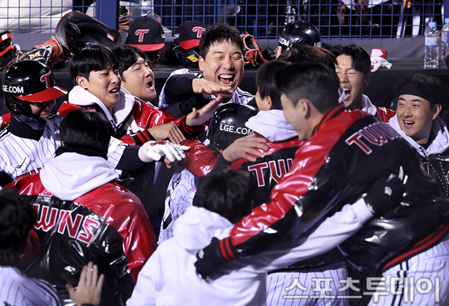 [½ºÆ÷Ã÷Åõµ¥ÀÌ ÆØÇöÁØ ±âÀÚ] 27ÀÏ ¼¿ï Àá½Ç¾ß±¸Àå¿¡¼ ¿¸° 2025 KBO¸®±× LG Æ®À©½º¿Í ÇÑÈ À̱۽ºÀÇ Çѱ¹½Ã¸®Áî 2Â÷Àü, 2ȸ¸» ¹«»ç 2,3·ç LG ±¸º»ÇõÀÇ 2ŸÁ¡ Àû½ÃŸ ¶§ ȨÀÎÇÑ ¹Úµ¿¿ø°ú ¿ÀÁöȯÀÌ µ¿·áµéÀÇ ÃàÇϸ¦ ¹Þ°í ÀÖ´Ù. 2025.10.27.