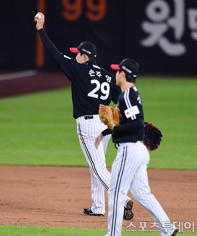 [´ëÀü=½ºÆ÷Ã÷Åõµ¥ÀÌ ±Ç±¤ÀÏ ±âÀÚ] 2025 ½ÅÇÑÀºÇà SOL Bank KBO¸®±× Çѱ¹½Ã¸®Áî 3Â÷Àü LGÆ®À©½º¿Í ÇÑÈ À̱۽ºÀÇ °æ±â°¡ 29ÀÏ ´ëÀüÇÑÈ»ý¸í º¼ÆÄÅ©¿¡¼ ¿·È´Ù. LG ¼ÕÁÖ¿µÀÌ 2ȸ¸» ´õºí¾Æ¿ô ½Ã۰í ÀÖ´Ù. 2025.10.29.