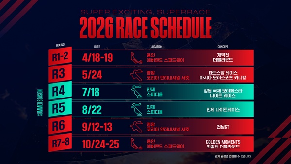 2026 ¿À³× ½´ÆÛ·¹À̽º èÇǾð½ÊÀº 4¿ù °³¸·ÀüºÎÅÍ 10¿ù ÃÖÁ¾Àü±îÁö ¾à 7°³¿ù°£ÀÇ ¶ß°Å¿î ·¹À̽º°¡ À̾îÁö¸ç ÃÑ 6ȸ ´ëȸ, 8¶ó¿îµå üÁ¦·Î ¿î¿µµÈ´Ù.