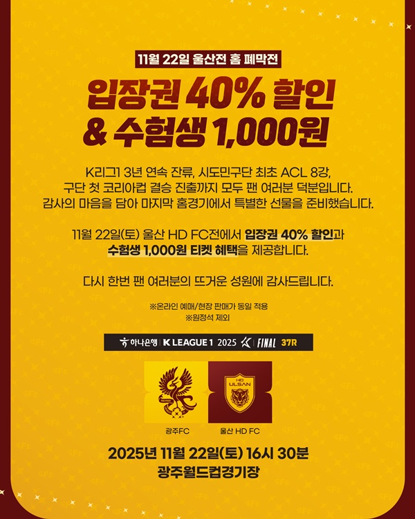 ±¤ÁÖ´Â ¿À´Â 22ÀÏ ¿ÀÈÄ 4½Ã 30ºÐ, ±¤ÁÖ¿ùµåÄŰæ±âÀå¿¡¼ ¿¸®´Â ÇϳªÀºÇà K¸®±×1 2025 37¶ó¿îµå ¿ï»êHD FCÀüÀ» Ȩ Æó¸·ÀüÀ¸·Î Ä¡¸£¸ç, ÆÒµéÀÇ ¶ß°Å¿î ¼º¿ø¿¡ º¸´äÇϰíÀÚ ÀÔÀå±Ç 40% ÇÒÀÎ À̺¥Æ®¸¦ ½Ç½ÃÇÑ´Ù°í ¹àÇû´Ù.