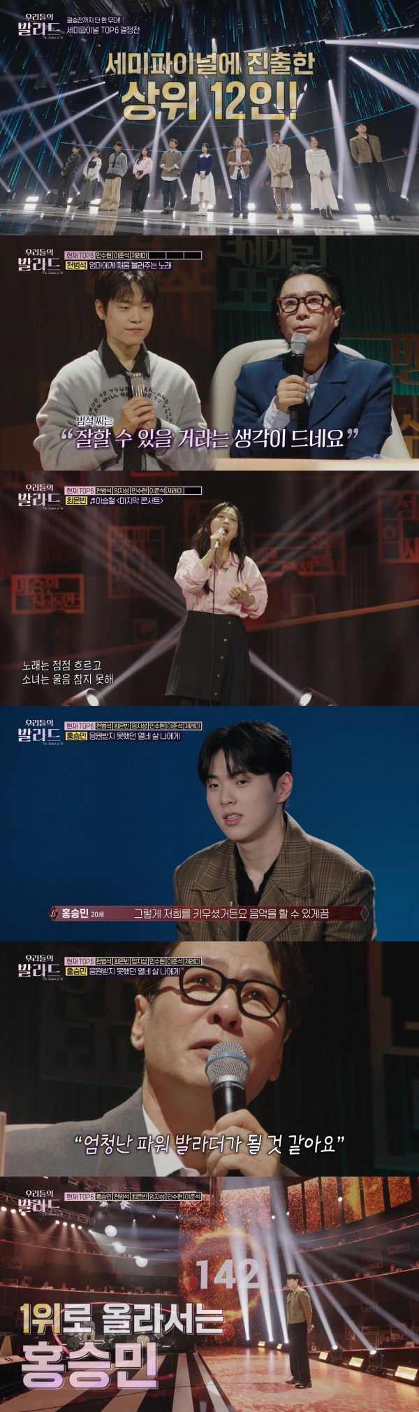 À̳¯ ¹æ¼Û¿¡¼´Â ÆÄÀ̳ΠÁøÃâÀÚ 6ÀÎÀ» °¡¸®´Â 4¶ó¿îµå ¼¼¹ÌÆÄÀ̳ΠTOP 6 ¼øÀ§ ÀïÅ»ÀüÀÇ ¸·ÀÌ ¿Ã¶ú´Ù. 'ÇåÁ¤ ¹ß¶óµå'¸¦ ÁÖÁ¦·Î ƯÁ¤ ´ë»óÀ» ÇâÇÑ ¸¶À½ÀÌ ´ã±ä TOP 12ÀÇ ³ë·¡¿¡´Â ¾ÖÀýÇÔ°ú ¾ÖƶÇÔÀÌ ¹¯¾î³µÀ¸¸ç ¹«·Á 142Ç¥¸¦ ¹ÞÀº È«½Â¹ÎÀÌ ÇöÀç 1À§¿¡ ¿Ã¶ú´Ù.
