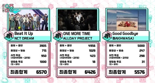 À̳¯ È»çÀÇ 'Good Goodbye'(±Â ±Â¹ÙÀÌ)°¡ ÃÑÁ¡ 5576Á¡À», ¿Ãµ¥ÀÌÇÁ·ÎÁ§Æ®ÀÇ 'ONE MORE TIME'(¿ø ¸ð¾î ŸÀÓ)ÀÌ 6426Á¡À» ¹Þ¾Æ °¢°¢ 3À§¿Í 2À§¿¡ À̸§À» ¿Ã·È´Ù.