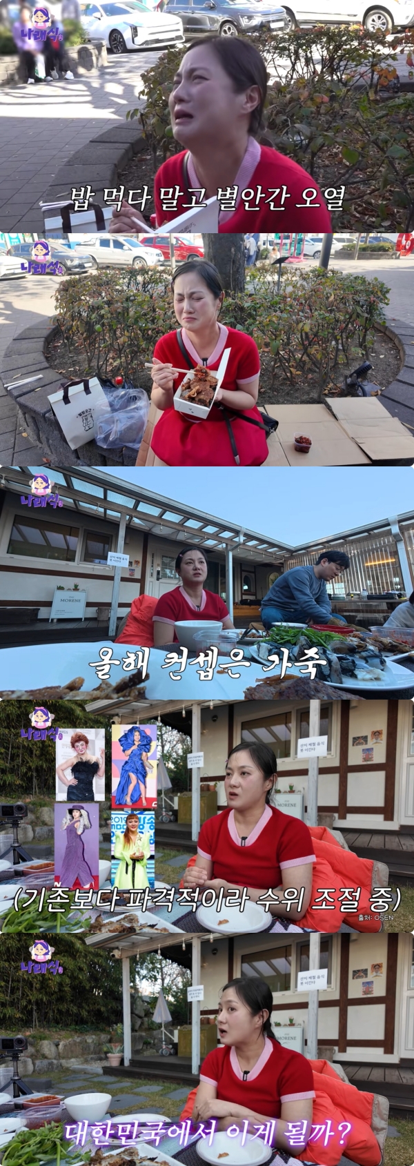 ÀÌ¾î ¿ÃÇØ ¿¬¸» ½Ã»ó½Ä¿¡¼ ÀÔÀ» µå·¹½º¸¦ ½ºÆ÷Çß´Ù. ¹Ú³ª·¡´Â "¿ÃÇØ ÄܼÁÆ®´Â °¡Á×"À̶ó¸ç "Áö±Ý ¼öÀ§ Á¶Àý ÁßÀÌ´Ù. ´ëÇѹα¹¿¡¼ ÀÌ°Ô µÉ±î?"¶ó°í ±Í¶êÇØ ´«±æÀ» ²ø¾ú´Ù. ÀÌ¿¡ Á¦ÀÛÁøÀÌ "¼³¸¶ äÂï µé¾î¿ä?"¶ó¸ç ³î¶ó ¿ôÀ½À» ¾È°å´Ù.