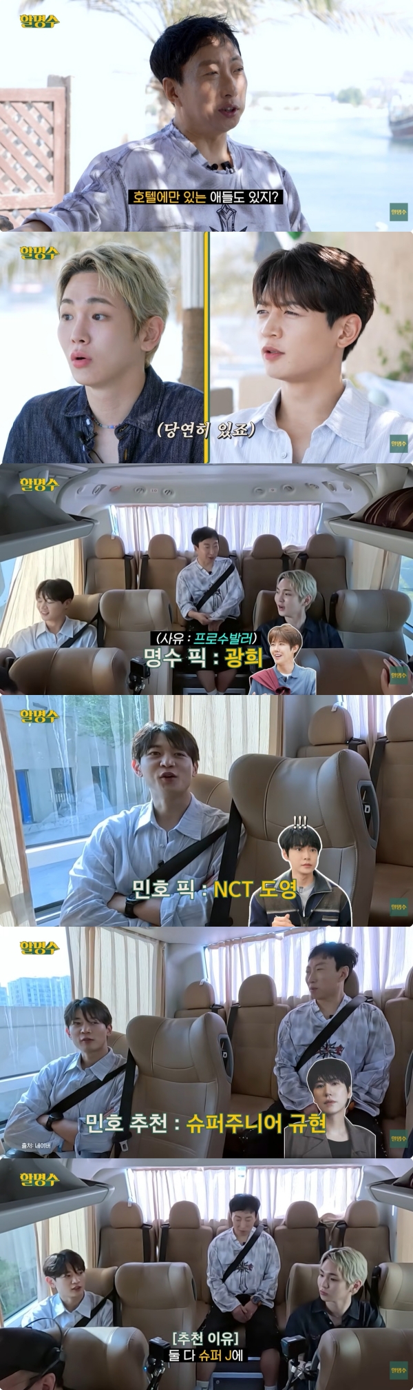 ¹ÎÈ£´Â »þÀÌ´Ï ¸â¹öµéÀ» Á¦¿ÜÇϰí SM ½Ä±¸µé Áß¿¡ ´©±¸¿Í ¿©ÇàÀ» °¡°í ½Í³Ä´Â Áú¹®¿¡ NCT µµ¿µÀ» °ñ¶ú´Ù. ±× ÀÌÀ¯¿¡ ´ëÇØ "¼ö¹ßÀÌ ÁÁ±ä ÇÏ´Ù"¶ó°í ¸»Çß´Ù. µµ¿µ°ú ¿µ»óÀ» Âï¾ú´ø ¹Ú¸í¼ö´Â "µµ¿µÀ̰¡ µÇ°Ô ºÎÁö·±ÇÏ´õ¶ó"¶ó°í ĪÂùÇß´Ù. ¹ÎÈ£´Â "¸Â´Ù. ±×¸®°í ³î·ÈÀ» ¶§ Ÿ°Ý°¨ÀÌ ÁÁ´Ù"°í µ¡ºÙ¿´´Ù.