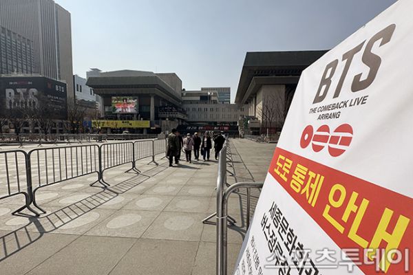 [½ºÆ÷Ã÷Åõµ¥ÀÌ ±Ç±¤ÀÏ ±âÀÚ] ¹æÅº¼Ò³â´Ü(BTS) ¼¿ï ±¤È¹®±¤Àå ÄÄ¹é °ø¿¬À» ¾ÕµÐ 17ÀÏ ¼¿ï Á¾·Î±¸ ±¤È¹®±¤Àå¿¡¼ 'BTS ÄÄ¹é ¶óÀ̺ê: ¾Æ¸®¶û(ARIRANG)' ¹«´ë¼³Ä¡¸¦ Çϰí ÀÖ´Ù. ÇÑÆí ±¤È¹®±¤ÀåÀº ¹Ì¸® ±¸°æ ³ª¿Â ÆÒµé°ú °ø¿¬À» ÁغñÁßÀÎ ÀÛ¾÷ÀÚµé·Î ºÏÀûÀ̰í ÀÖ´Ù. 2026.03.17.