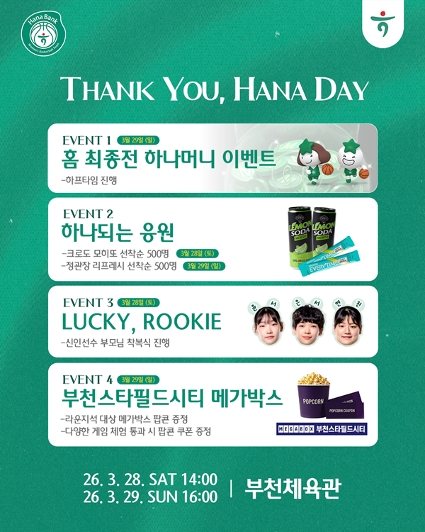 À̹ø 'THANK YOU, HANA DAY'´Â 2025-2026½ÃÁ𠸶Áö¸· Ȩ°æ±â ÁÖ°£À¸·Î ÇÑ ½ÃÁ𠵿¾È ÆÀÀ» ÀÀ¿øÇØÁØ ÆÒµé¿¡ ´ëÇÑ °¨»çÀÇ Àǹ̸¦ ´ã¾Æ ±âȹµÆ´Ù. ¸ÕÀú 28ÀÏ ºÎ»ê BNKÀü¿£ ÀÔÀå°üÁß ¼±Âø¼ø 500¸í ´ë»óÀ¸·Î Å©·Îµµ ¸ðÈ÷Åä À½·á¸¦ Á¦°øÇϸç, Ȩ°æ±â Á÷°ü ½ºÅÆÇÁ À̺¥Æ® Âü°¡ÀÚ ¼±Âø¼ø 111¸í¿¡°Ô ÇϳªÀºÇà ¿©ÀÚ³ó±¸´Ü ÀÀ¿ø ¸ÓÇ÷¯¸¦ ÁõÁ¤ÇÑ´Ù. ¶ÇÇÑ ÇÏÇÁŸÀÓ¿¡´Â 2025-2026½ÃÁð ÀÔ´ÜÇÑ ½ÅÀÎ ¼±¼ö(ȲÀ±¼, ÀÌÀº¼, ±è¿¬Áø)µéÀÇ ºÎ¸ð´Ôµé¿¡°Ô °¨»çÀÇ ¸¶À½À» ÀüÇÏ´Â Çà»ç¸¦ ÁøÇàÇÑ´Ù.