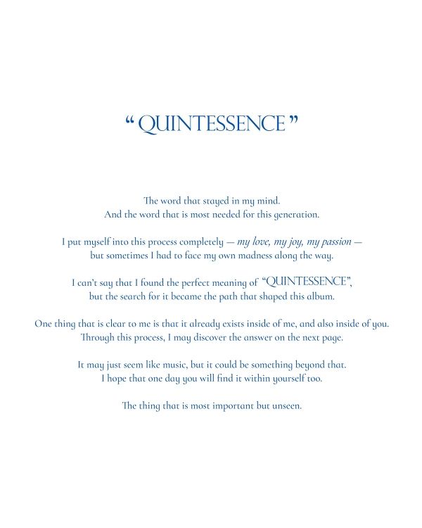 °ø°³µÈ À̹ÌÁö¿¡´Â 'QUINTESSENCE'¶ó´Â ´Ü¾î¿Í ÇÔ²², Àǹ̽ÉÀåÇÑ ¸Þ½ÃÁö°¡ ´ã°Ü ÀÖ¾î ´«±æÀ» »ç·ÎÀâ´Â´Ù. '³» ¸¶À½ ¼Ó¿¡ ¸Ó¹«¸¥ ´Ü¾î, ÀÌ ½Ã´ë°¡ °¡Àå ÇÊ¿ä·Î ÇÏ´Â ´Ü¾î'¶ó´Â ¾ð±ÞÀ¸·Î ½ÃÀÛÇØ '°¡Àå Áß¿äÇÑ °ÍÀº º¸ÀÌÁö ¾Ê´Â´Ù'´Â ¹®ÀåÀ¸·Î ¸¶¹«¸®ÇÑ ¸Þ½ÃÁö´Â ±Ã±ÝÁõÀ» ÀھƳ»¸ç ÄÄ¹é ±â´ë°¨À» ³ôÀ̰í ÀÖ´Ù.