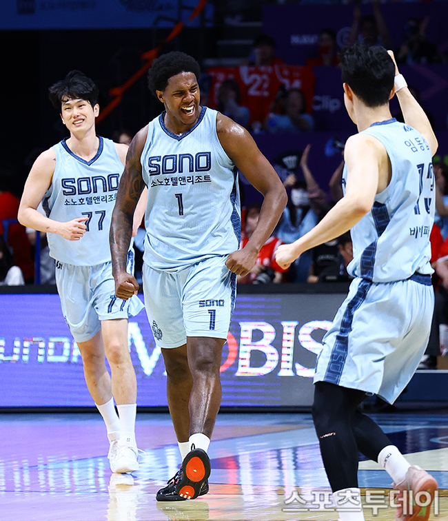 [°í¾ç(°æ±â)=½ºÆ÷Ã÷Åõµ¥ÀÌ ÆØÇöÁØ ±âÀÚ] 16ÀÏ °æ±âµµ °í¾çüÀ°°ü¿¡¼ ¿¸° 2025-2026 KBL 6° Ç÷¹ÀÌ¿ÀÇÁ °í¾ç ¼Ò³ë¿Í ¼¿ï SKÀÇ 3Â÷Àü, ¼Ò³ë ³ªÀÌÆ®°¡ °ñÀ» ³Ö°í ÀÖ´Ù. 2026.04.16.