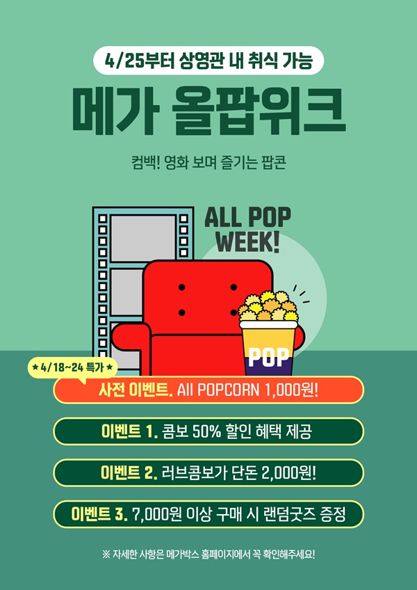 Ãë½Ä ÇØÁ¦ Àü ÀÏÁÖÀϰ£ ÀÌ·ïÁö´Â »çÀü À̺¥Æ®´Â 'ALL POPCORN 1000¿ø!' À̸§À¸·Î ÁøÇàµÈ´Ù. L»çÀÌÁî ÆËÄÜ ±¸¸Å ½Ã ¸À¿¡ °ü°è¾øÀÌ 1õ¿ø¿¡ ±¸¸Å °¡´ÉÇϸç 18ÀϺÎÅÍ 24ÀϱîÁö ÁøÇàÇÑ´Ù. ÆËÄÜ Åë Çϳª¿¡ µÎ °¡Áö ¸À(¹Ý¹Ý)À» ´ã´Â ¸Þ´º´Â Á¦¿ÜµÇ¸ç Áߺ¹ ÇÒÀÎÀº ºÒ°¡ÇÏ´Ù.