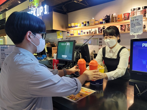 À̳¯ºÎÅÍ ¿µÈ°ü¿¡ ¹æ¹®ÇÑ °í°´µéÀº ÇöÀå ¸ÅÁ¡ ¶Ç´Â ¸ð¹ÙÀÏ ¿À´õ, Ű¿À½ºÅ©(KIOSK)¿¡¼ ź»êÀ½·á(R) »çÀÌÁ ÁÖ¹® ½Ã ÀÏȸ¿ëÄŰú ´Ùȸ¿ëÄÅ Áß ¼±ÅÃÇØ À½·á¸¦ ÀÌ¿ëÇÒ ¼ö ÀÖ´Ù. ´Ùȸ¿ëÄÅ¿¡ À½·á¸¦ ´ã¾Æ ¸¶½Ã°í ·Îºñ¿¡ ºñÄ¡µÈ Àü¿ë ¼ö°ÅÇÔ¿¡ ¹Ý³³ÇÏ¸é Æ®·¡½¬¹ö½ºÅÍÁî°¡ ¼ö°ÅÇØ ´Ùȸ¿ë±â 6´Ü°è Àü¹® ¼¼Ã´ ¹× UV-C »ì±Õ ¼Òµ¶°ú °Ë¼ö °úÁ¤À» ÁøÇàÇÑ´Ù.