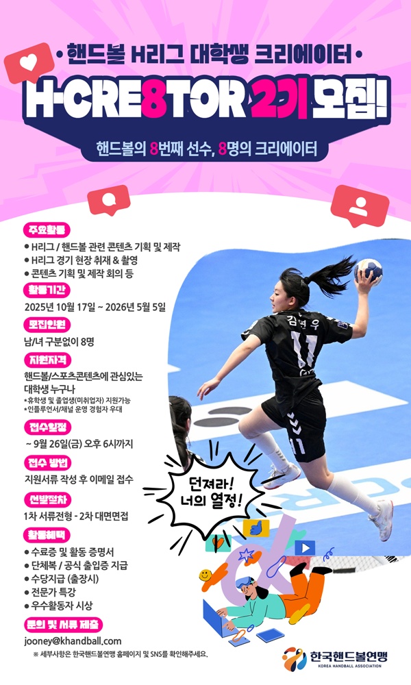 Çѱ¹Çڵ庼¿¬¸ÍÀº ´ëÇлý Å©¸®¿¡ÀÌÅ͸¦ ÄÚÆ® ¹Û¿¡¼ ¶Ù´Â Çڵ庼ÀÇ 8¹øÂ° ¼±¼ö¶ó´Â Àǹ̷Π'H-CRE8TOR'·Î ¸í¸íÇÏ¿´À¸¸ç(¼ýÀÚ 8-eight-ÀÇ ¿µ¾î¹ßÀ½°ú creator ¹ßÀ½ÀÇ À¯»çÁ¡ Âø¾È), ¼·ù Á¢¼ö, ¼·ù ÇÕ°ÝÀÚ ¹ßÇ¥, ¸éÁ¢À» °ÅÃÄ ÃÑ8¸íÀÇ Å©¸®¿¡ÀÌÅ͸¦ ¼±¹ßÇÒ ¿¹Á¤ÀÌ´Ù. ¼±¹ßµÈ Å©¸®¿¡ÀÌÅÍ´Â ±Ý³â 10¿ùºÎÅÍ ³»³â 5¿ù±îÁö H¸®±× À¯Æ©ºê/ ÀνºÅ¸±×·¥ ¹× SNS ÄÜÅÙÃ÷ ±âȹ/Á¦ÀÛ, H¸®±× °æ±â ÇöÀå ÃëÀç/ÃÔ¿µ, H-CRE8TOR ¿öÅ©¼ó Âü¿© µîÀÇ È°µ¿À» ÁøÇàÇÑ´Ù.