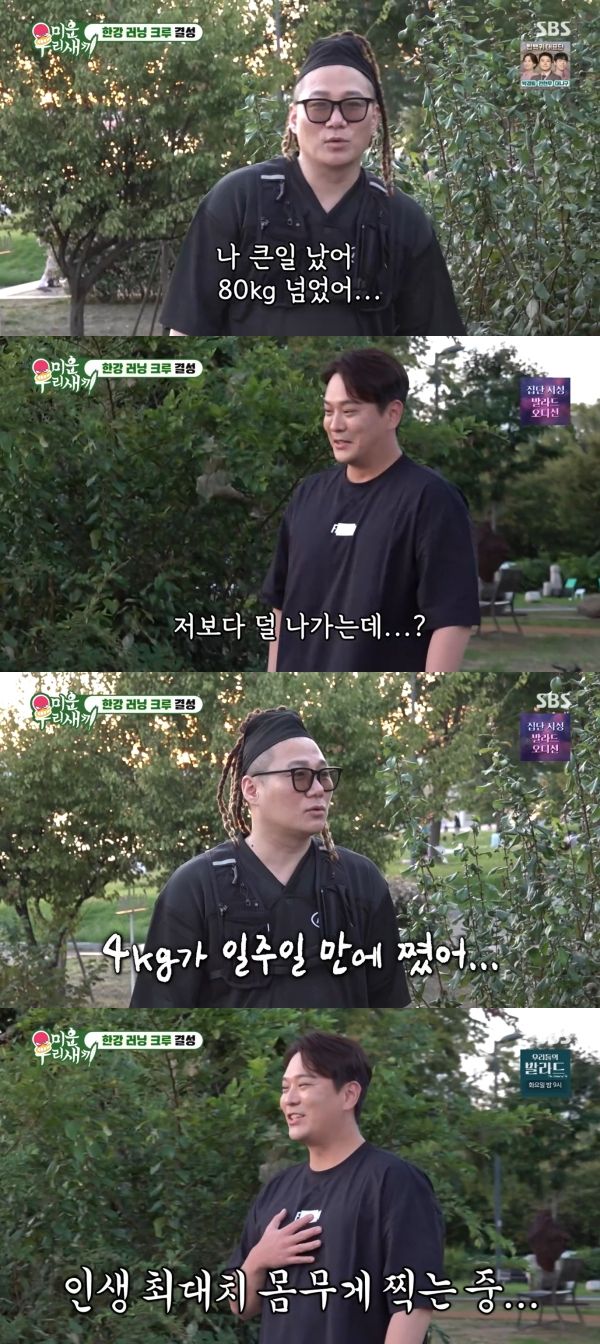 ¼·Î ¸ö¹«°Ô¿¡ ´ëÇØ À̾߱âÇÏ´ø Áß, ±è¿ëÁØÀº "81kg? Àúº¸´Ù ´ú ³ª°£´Ù"°í ¸»Çß´Ù. ÀÌ¿¡ À±¹Î¼ö´Â "³ª´Â ÀÏÁÖÀÏ ¸¸¿¡ 4kg ÂÈ´Ù"°í °í¹éÇß´Ù.