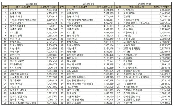 5ÀÏ Çѱ¹±â¾÷ÆòÆÇ¿¬±¸¼Ò°¡ ¹ßÇ¥ÇÑ 2025³â 10¿ù ¿¹´É ÇÁ·Î±×·¥ ºê·£µåÆòÆÇ ¼øÀ§¿¡ µû¸£¸é 1À§ ³ªÈ¥ÀÚ»ê´Ù, 2À§ ³î¸é ¹¹ÇÏ´Ï, 3À§ ·±´×¸Ç ¼øÀ¸·Î ºÐ¼®µÆ´Ù.