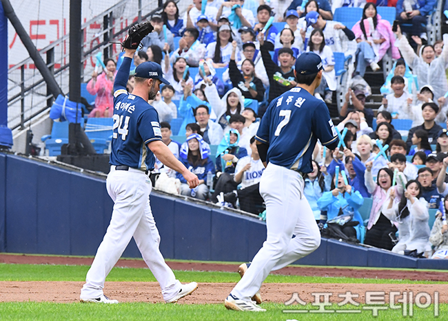 [´ë±¸=½ºÆ÷Ã÷Åõµ¥ÀÌ ÆØÇöÁØ ±âÀÚ] 6ÀÏ ´ë±¸ »ï¼º¶óÀÌ¿ÂÁîÆÄÅ©¿¡¼ ¿¸° 2025 KBO¸®±× Æ÷½ºÆ®½ÃÁð NC ´ÙÀ̳뽺¿Í »ï¼º ¶óÀÌ¿ÂÁîÀÇ ¿ÍÀϵåÄ«µå(WC) °áÁ¤Àü 1Â÷Àü, 1ȸ¸» ¼öºñ¸¦ ³¡³»´Â µ¥À̺ñ½¼ÀÇ È£¼öºñ¿¡ ÆÒµéÀÌ È¯È£Çϰí ÀÖ´Ù. 2025.10.06.