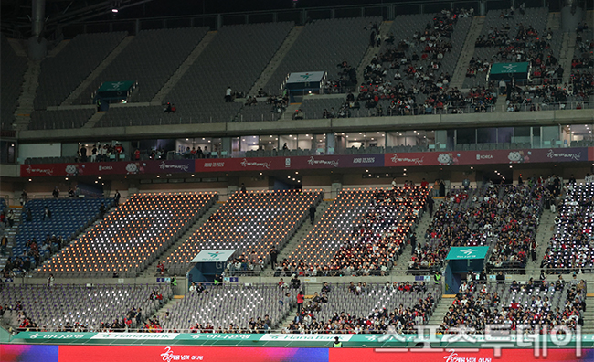[½ºÆ÷Ã÷Åõµ¥ÀÌ ÆØÇöÁØ ±âÀÚ] 14ÀÏ ¼¿ï¿ùµåÄŰæ±âÀå¿¡¼ ¿¸° Ã౸ ±¹°¡´ëÇ¥ÆÀ Çѱ¹°ú ÆÄ¶ó°úÀÌÀÇ Ä£¼±°æ±â ½ÃÀÛÀ» ¾ÕµÎ°í °æ±âÀåÀÌ ÅÖºó ¸ð½ÀÀ» Çϰí ÀÖ´Ù. »ó¾ÏÀº 2¸¸¸í ³²ÁþÇÑ ÆÒµéÀÌ ÀÚ¸®¸¦ Çß´Ù. 2025.10.14.
