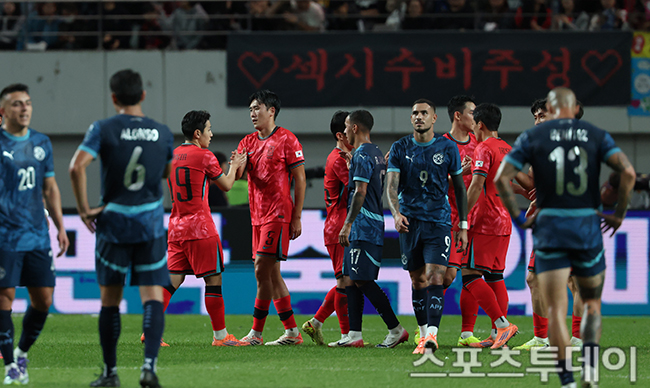 [½ºÆ÷Ã÷Åõµ¥ÀÌ ÆØÇöÁØ ±âÀÚ] 14ÀÏ ¼¿ï¿ùµåÄŰæ±âÀå¿¡¼ ¿¸° Ã౸ ±¹°¡´ëÇ¥ÆÀ Çѱ¹°ú ÆÄ¶ó°úÀÌÀÇ Ä£¼±°æ±â, 2-0À¸·Î Çѱ¹ÀÌ ½Â¸®Çϰí ÀÖ´Ù. 2025.10.14.
