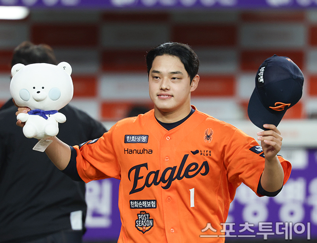 [´ëÀü=½ºÆ÷Ã÷Åõµ¥ÀÌ ÆØÇöÁØ ±âÀÚ] 18ÀÏ ´ëÀüÇÑÈ­»ý¸íº¼ÆÄÅ©¿¡¼­ ¿­¸° 2025 KBO¸®±× Æ÷½ºÆ®½ÃÁð Ç÷¹ÀÌ¿ÀÇÁ »ï¼º ¶óÀÌ¿ÂÁî¿Í ÇÑÈ­ À̱۽ºÀÇ 1Â÷Àü, 9-8·Î ÇÑÈ­°¡ ½Â¸®Çß´Ù. ÇÑÈ­ ¹®µ¿ÁÖ°¡ µ¥Àϸ®MVP¸¦ ¹Þ°í ÀÖ´Ù. 2025.10.18.