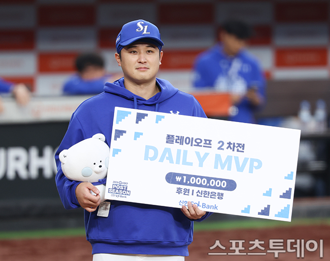 [´ëÀü=½ºÆ÷Ã÷Åõµ¥ÀÌ ÆØÇöÁØ ±âÀÚ] 19ÀÏ ´ëÀüÇÑÈ»ý¸íº¼ÆÄÅ©¿¡¼ ¿¸° 2025 KBO¸®±× Æ÷½ºÆ®½ÃÁð Ç÷¹ÀÌ¿ÀÇÁ »ï¼º ¶óÀÌ¿ÂÁî¿Í ÇÑÈ À̱۽ºÀÇ 2Â÷Àü, »ï¼ºÀÌ 7-3À¸·Î ½Â¸®Çß´Ù. »ï¼º ¼±¹ßÅõ¼ö ÃÖ¿øÅ°¡ MVP¸¦ ¹Þ°í ÀÖ´Ù. 2025.10.19.