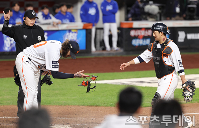 [´ëÀü=½ºÆ÷Ã÷Åõµ¥ÀÌ ÆØÇöÁØ ±âÀÚ] 24ÀÏ ´ëÀüÇÑÈ»ý¸íº¼ÆÄÅ©¿¡¼ ¿¸° 2025 KBO¸®±× Æ÷½ºÆ®½ÃÁð »ï¼º ¶óÀÌ¿ÂÁî¿Í ÇÑÈ À̱۽ºÀÇ Ç÷¹ÀÌ¿ÀÇÁ 5Â÷Àü, 3ȸÃÊ 2»ç 1,2·ç ÇÑÈ ÃÖÀçÈÆÀÌ »ï¼º ±èÅÂÈÆÀÇ Æ÷¼ö ¶¥º¼À» ó¸®Çϸç ÀÌ´×À» ³¡³»ÀÚ Æù¼¼°¡ Æ÷¼ö ¸¶½ºÅ©¸¦ µé°í ÃÖÀçÈÆ¿¡°Ô ÀλçÇϰí ÀÖ´Ù. 2025.10.24.