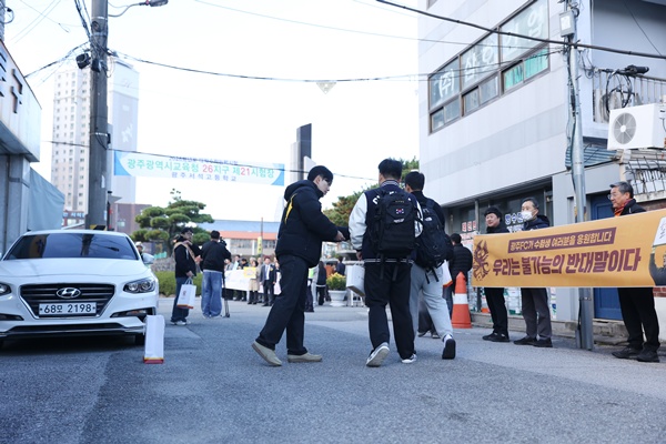 ±¤ÁÖ´Â 13ÀÏ ¼ö´É ½ÃÇèÀÏ ¿ÀÀü, ±¤ÁÖ¼¼®°íµîÇб³¸¦ ¹æ¹®ÇØ 2025Çг⵵ ´ëÇмöÇдɷ½ÃÇèÀ» Ä¡¸£´Â ¼öÇè»ýµé¿¡°Ô ÀÀ¿øÀÇ ¸Þ½ÃÁö¿Í ÇÔ²² Á÷Á¢ Æ÷ÀåÇÑ °£½Ä ²Ù·¯¹Ì¸¦ Àü´ÞÇß´Ù°í ¹àÇû´Ù.