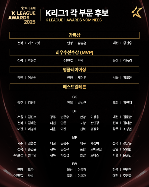 Çѱ¹ÇÁ·ÎÃ౸¿¬¸Í(ÃÑÀç ±Ç¿À°©, ÀÌÇÏ '¿¬¸Í')Àº ¡®ÇϳªÀºÇà K¸®±× 2025 ´ë»ó ½Ã»ó½Ä'À» ¾ÕµÎ°í, 19ÀÏ K¸®±× °³Àλó Èĺ¸¼±Á¤À§¿øÈ¸(ÀÌÇÏ 'À§¿øÈ¸')¸¦ ¿¾î, ¿Ã ½ÃÁð K¸®±×1, 2 ÃÖ¿ì¼ö°¨µ¶»ó, ÃÖ¿ì¼ö¼±¼ö»ó(MVP), ¿µÇ÷¹À̾î»ó, º£½ºÆ®ÀÏ·¹ºì ºÎ¹®ÀÇ 3¹è¼ö È常¦ ¼±Á¤Çß´Ù.