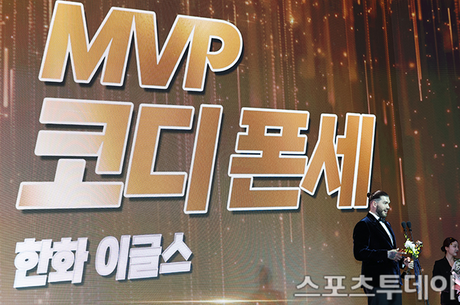 ÇÑÈ ÄÚµð Æù¼¼°¡ MVP»óÀ» ¹Þ°í ¼Ò°¨À» ÀüÇϰí ÀÖ´Ù. 2025.11.24.