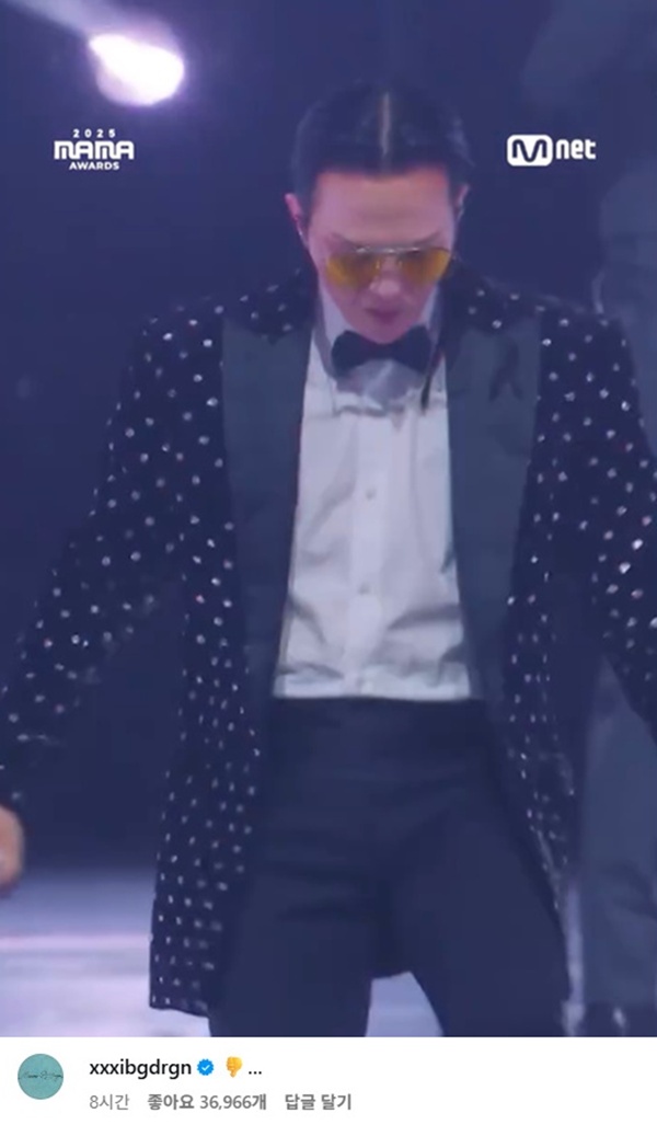 Áöµå·¡°ïÀº Áö³ 29ÀÏ '2025 ¸¶¸¶ ¾î¿öÁî(2025 MAMA AWARDS)' °ø½Ä °èÁ¤¿¡ ¿Ã¶ó¿Â ÀÚ½ÅÀÇ ¹«´ë ¿µ»ó ´ñ±Û¿¡ ¾öÁö¸¦ ¾Æ·¡·Î ³»¸° 'ºÕµû' À̸ðƼÄÜÀ» ³²°å´Ù.
