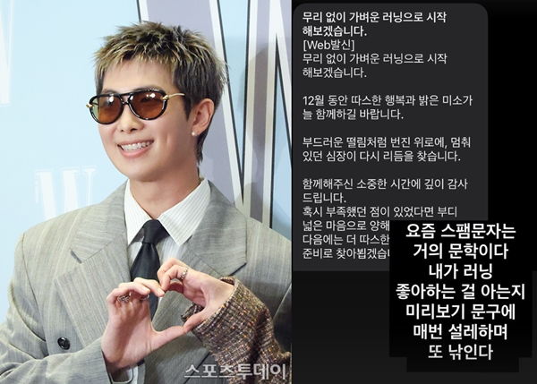 2ÀÏ RMÀº °³ÀÎ SNS¿¡ ½ºÆÔ¹®ÀÚ¸¦ Ä¸Ã³ÇØ °ø°³Çß´Ù. ÇØ´ç ĸó¸¦ ÅëÇØ '¹«¸® ¾øÀÌ °¡º¿î ·¯´×À¸·Î ½ÃÀÛÇØº¸°Ú½À´Ï´Ù'¶ó´Â ¹®ÀåÀ¸·Î ½ÃÀÛÇÏ´Â ½ºÆÔ ¹®ÀÚ ³»¿ëÀ» È®ÀÎÇÒ ¼ö ÀÖ´Ù.