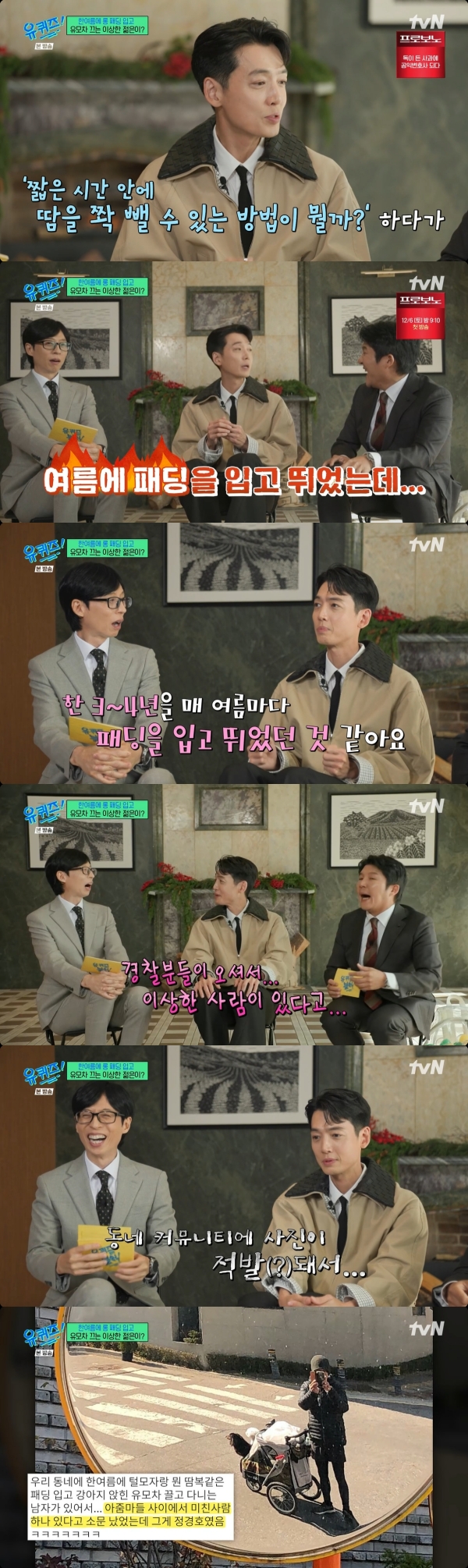 ±×·¯¸é¼ "µ¿³×¿¡¼ ¿©¸§¿¡ ÆÐµù ÀÔ°í ¶Ù´Ï±î °æÂûºÐµéÀÌ ¿À¼Ì´Ù. ÀÌ»óÇÑ »ç¶÷ÀÌ ÀÖ´Ù°í. µ¿³× Ä¿¹Â´ÏƼ¿¡ »çÁøÀÌ Àû¹ßµÆ´Ù. Á¦°¡ »ý°¢Çصµ ¿ô±â´Ù. °¾ÆÁö À¯¸ðÂ÷¿¡ ÇÑ¿©¸§¿¡ ÆÐµùÀ» ÀÔ°í ¶Ù´Âµ¥ ¸ÖÂÄÇÏ°Ô Áý¿¡ µé¾î°¡´Â ÀÌ»óÇÑ ÀþÀºÀÌ. ±×·¡¼ °æÂûºÐµéÀÌ Á¤¸» ±Ã±ÝÇØ¼ ¿Ô´Ù´õ¶ó. ÀúÀÎ ÁÙ ¾Æ½Ã°í ±ô¦ ³î¶ú´Ù"°í ÇØ ¿ôÀ½À» ÀھƳ´Ù.