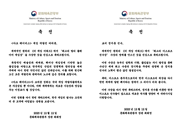 ÃÖ Àå°üÀº '¾ÆÅ© ·¹ÀÌ´õ½º' °³¹ßÁø¿¡°Ô "À̹ø ¼ö»óÀº µ¶Ã¢ÀûÀÎ ¿¹¼ú¼º°ú ¼¼°è°ü, ¶Ù¾î³ °ÔÀÓ¼º¿¡ ±â¹ÝÇÑ ³ôÀº ¸ôÀÔ°¨À» ¹ÙÅÁÀ¸·Î Çѱ¹ °ÔÀÓ»ê¾÷ÀÇ °æÀï·Â°ú âÀǼºÀ» ¼¼°è ¹«´ë¿¡ ´Ù½Ã Çѹø °¢ÀνÃŲ °ªÁø ¼º°ú´Ù"¶ó°í °Ý·ÁÇß´Ù. Ãݺñ Á¤ÁöÈÆ ¼±¼ö¿¡°Ô´Â "À̹ø ¼ö»óÀº ´«ºÎ½Å ½Ç·Â°ú ±â·®, ²÷ÀÓ¾ø´Â Àڱ⠹ßÀüÀ» ÅëÇØ ¼ö³â°£ ¼¼°è ÃÖ°í ¼öÁØÀÇ °æ±â·ÂÀ» ²ÙÁØÈ÷ Áõ¸íÇØ ¿Â Á¤ÁöÈÆ ¼±¼öÀÇ ³ë·ÂÀÌ ¸ÎÀº °ªÁø °á½Ç"À̶ó¸ç, "À̽ºÆ÷Ã÷ Á¾ÁÖ±¹À¸·Î¼ÀÇ Çѱ¹ À̽ºÆ÷Ã÷ÀÇ À§»óÀ» ´Ù½Ã Çѹø ¼¼°è¿¡ ¾Ë¸° Äè°Å"¶ó°í ÃàÇÏÇß´Ù.