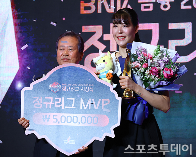 [½ºÆ÷Ã÷Åõµ¥ÀÌ ÆØÇöÁØ ±âÀÚ] KB½ºÅ¸Áî ¹ÚÁö¼ö°¡ 6ÀÏ ¼­¿ï ¿ë»ê µå·¡°ï½ÃƼ ±×·£µåº¼·ë ÇѶóȦ¿¡¼­ ¿­¸° 2025-2026 ¿©ÀÚÇÁ·Î³ó±¸ Á¤±Ô¸®±× ½Ã»ó½Ä¿¡¼­ MVP¸¦ ¼ö»óÇϰí ÀÖ´Ù. ½Ã»óÀÚ´Â WKBL ½Å»óÈÆ ÃÑÀç. 2026.04.06.