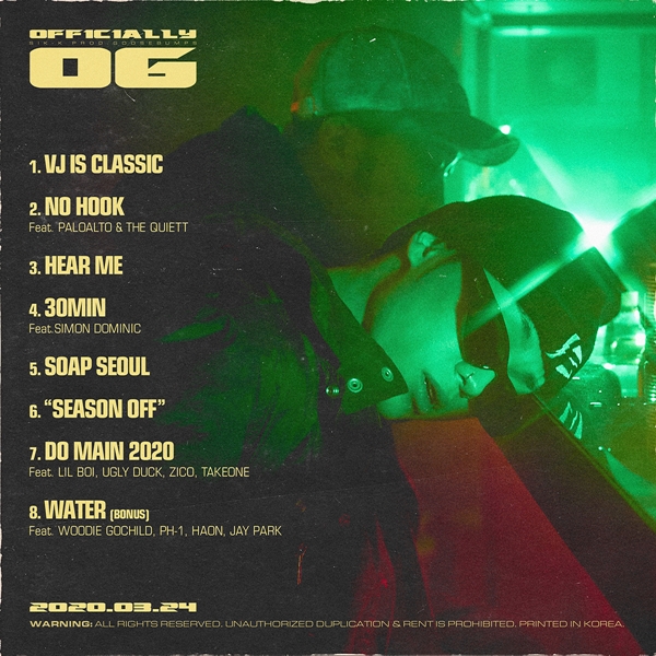 °ø°³µÈ Æ®·¢¸®½ºÆ®¿¡ µû¸£¸é 1¹ø Æ®·¢ ¡®VJ IS CLASSIC(Ŭ·¡½Ä)¡¯¸¦ ºñ·ÔÇØ ¡®NO HOOK(³ë ÈÄÅ©)(Feat. Paloalto & The Quiett)¡¯, ¡®¸ô¶ó(HEAR ME)¡¯, ¡®30ºÐ(30MIN)(Feat. »çÀÌ¸Õ µµ¹Ì´Ð)¡¯, ¡®SOAP SEOUL(¼ÒÇÁ ¼¿ï)¡¯, ¡®SEASON OFF(½ÃÁð ¿ÀÇÁ)¡¯, ¡®DO MAIN 2020(µÎ ¸ÞÀÎ 2020)(Feat. Lil Boi, Ugly Duck, ZICO, TakeOne)¡¯¿¡ º¸³Ê½º Æ®·¢ ¡¯WATER(¿öÅÍ)(Feat. Woodie Gochild, pH-1, HAON, ¹ÚÀç¹ü)¡®±îÁö ÃÑ 8°îÀÌ ¼ö·ÏµÆ´Ù.