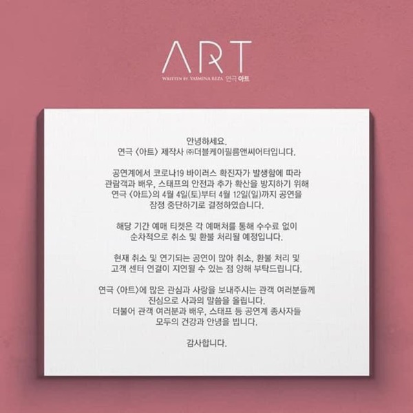 ¸ÕÀú Á¦ÀÛ»ç ÃøÀº "°ø¿¬°è¿¡¼ Äڷγª19 ¹ÙÀÌ·¯½º È®ÁøÀÚ°¡ ¹ß»ýÇÔ¿¡ µû¶ó °ü¶÷°´°ú ¹è¿ì, ½ºÅÂÇÁÀÇ ¾ÈÀü°ú Ãß°¡ È®»êÀ» ¹æÁöÇϱâ À§ÇØ ÀÌ °°Àº °áÁ¤À» ³»·È´Ù"°í ¼³¸íÇß´Ù.