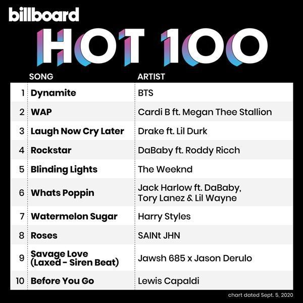'Dynamite'¿¡ ¾Õ¼ ¿ª´ë ºôº¸µå¿¡¼ ¹ß¸Å ù ÁÖ Â÷¿¡ 'ÇÖ 100' 1À§·Î ÁøÀÔÇÑ °îÀº ÃÑ 42°î¿¡ ºÒ°úÇß´Ù. ¸¶ÀÌŬ Àè½¼(Michael Jackson), ¸Ó¶óÀ̾î ij¸®(Mariah Carey), ÈÖÆ®´Ï ÈÞ½ºÅÏ(Whitney Houston), ¿¤Æ° Á¸(Elton John), ¼¿¸° µð¿Â(Celine Dion), ·Î¸° Èú(Lauryn Hill), ºê¸®Æ®´Ï ½ºÇǾ(Britney Spears), ¿¡¹Ì³Û(Eminem), ·¹À̵𠰡°¡(Lady GaGa), ÄÉÀÌÆ¼ Æä¸®(Katy Perry), Å×ÀÏ·¯ ½ºÀ§ÇÁÆ®(Taylor Swift), Àú½ºÆ¾ ºñ¹ö(Justin Bieber), ¾Æµ¨(Adele), ¿¡µå ½Ã·±(Ed Sheeran), µå·¹ÀÌÅ©(Drake) µî ¹Ì±¹»Ó¸¸ ¾Æ´Ï¶ó Àü ¼¼°è¿¡¼ Àα⸦ ¾ò°í ÀÖ´Â °¡¼öµéÀÇ °îÀ̾ú´Ù. ÀÌ °¡¿îµ¥ ¼Ö·Î °¡¼ö¿Í ÇÇó¸µÀ» Á¦¿ÜÇÑ ¹ß¸Å ù ÁÖ 'ÇÖ 100' 1À§ ±×·ìÀº ¿¡¾î·Î½º¹Ì½º(Aerosmith), Á¶³ª½º ºê¶ó´õ½º(Jonas Brothers), ´õ ½ºÄÚÃ÷(The Scotts)»ÓÀ̾ú°í, ÀÌÁ¦ ¹æÅº¼Ò³â´ÜÀÌ À̵é°ú ¾î±ú¸¦ ³ª¶õÈ÷ ÇÏ°Ô µÆ´Ù.