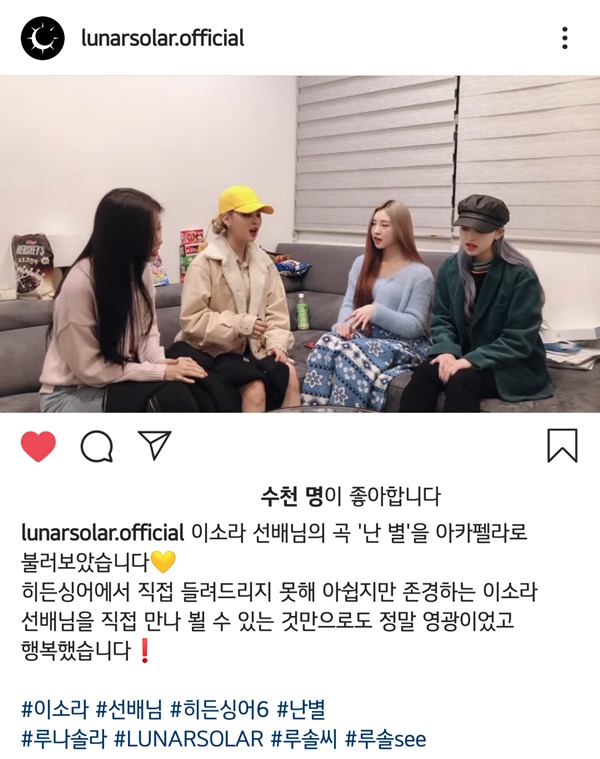 2ÀÏ Á¦ÀÌÇ÷¡´Ö ¿£ÅÍÅ×ÀÎ¸ÕÆ®¿¡ µû¸£¸é Áö³´Þ 30ÀÏ ¹æ¼ÛµÈ JTBC 'È÷µç½Ì¾î6' À̼Ҷó Æí¿¡ À¯ÀÏÇÑ ½ÅÀÎÀ¸·Î Ã⿬ÇÑ ·ç³ª¼Ö¶ó´Â ´çÀÏ ÀÌ¼Ò¶ó¿¡°Ô Á÷Á¢ µé·ÁÁֽЏøÇÑ À̼ҶóÀÇ '³ º°' ¾ÆÄ«Æç¶ó ¿µ»óÀ» °ø½Ä SNS¸¦ ÅëÇØ °ø°³Çϸç ÀÌ¼Ò¶ó¿¡ ´ëÇÑ Á¸°æÀÇ ¸¶À½À» Ç¥ÇöÇß´Ù.