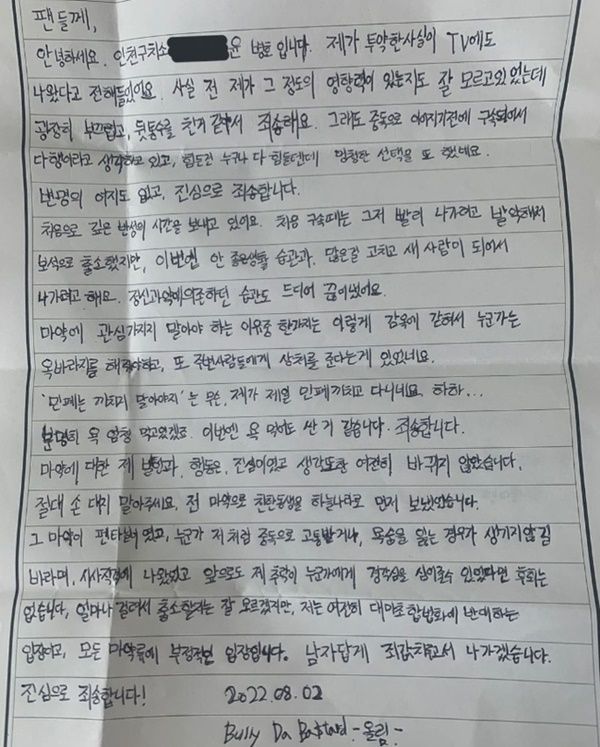 ÀÎõ±¸Ä¡¼Ò¿¡ ¼ö°¨ ÁßÀÎ À±º´È£´Â ¸¶¾à Åõ¾à¿¡ ´ëÇØ "Áßµ¶À¸·Î À̾îÁö±â Àü¿¡ ±¸¼ÓµÅ ´ÙÇà"À̶ó¸ç "º¯¸íÀÇ ¿©Áöµµ ¾ø°í, Áø½ÉÀ¸·Î Á˼ÛÇÏ´Ù. óÀ½À¸·Î ±íÀº ¹Ý¼ºÀÇ ½Ã°£À» º¸³»°í ÀÖ´Ù"°í ÀÚ½ÅÀÇ °ú¿À¸¦ ¹Ý¼ºÇß´Ù.