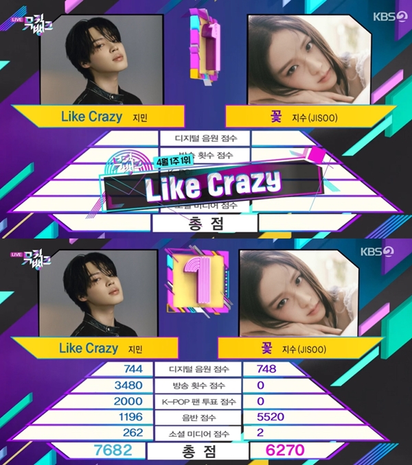 7ÀÏ ¹æ¼ÛµÈ KBS2 À½¾Ç¹æ¼Û '¹ÂÁ÷¹ðÅ©'¿¡¼´Â ¹æÅº¼Ò³â´Ü Áö¹ÎÀÇ '¶óÀÌÅ© Å©·¹ÀÌÁö'(Like Crazy)¿Í ºí·¢ÇÎÅ© Áö¼öÀÇ '²É'ÀÌ 1À§ È帷Π°Ýµ¹Çß´Ù.