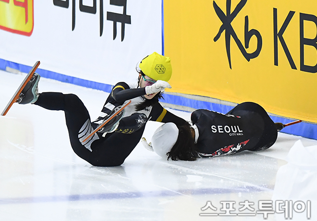 [½ºÆ÷Ã÷Åõµ¥ÀÌ ÆØÇöÁØ ±âÀÚ] 11ÀÏ ¿ÀÀü ¼­¿ï ¸ñµ¿¾ÆÀ̽º¸µÅ©¿¡¼­ ¿­¸° 2024-2025 ½ÃÁð ¼îƮƮ·¢ ±¹°¡´ëÇ¥ 2Â÷ ¼±¹ßÀü ¿©ÀÚ 500m Áذá½Â¿¡¼­ ÀÌÀ¯ºó(³ë¶õÇï¸ä)°ú ¹ÚÁöÀ±(Èò»öÇï¸ä)ÀÌ Ãæµ¹ÇÏ¸ç ¾²·¯Áö°í ÀÖ´Ù. 2024.04.11.