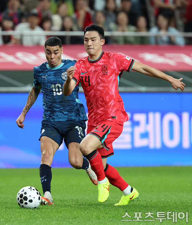 [½ºÆ÷Ã÷Åõµ¥ÀÌ ÆØÇöÁØ ±âÀÚ] 14ÀÏ ¼¿ï¿ùµåÄŰæ±âÀå¿¡¼ ¿¸° Ã౸ ±¹°¡´ëÇ¥ÆÀ Çѱ¹°ú ÆÄ¶ó°úÀÌÀÇ Ä£¼±°æ±â, Çѱ¹ Á¶À¯¹ÎÀÌ °ø°ÝÇϰí ÀÖ´Ù. 2025.10.14.
