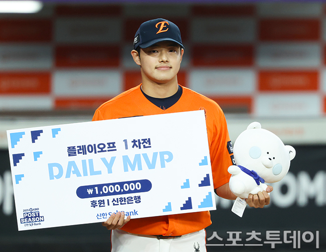 [´ëÀü=½ºÆ÷Ã÷Åõµ¥ÀÌ ÆØÇöÁØ ±âÀÚ] 18ÀÏ ´ëÀüÇÑÈ­»ý¸íº¼ÆÄÅ©¿¡¼­ ¿­¸° 2025 KBO¸®±× Æ÷½ºÆ®½ÃÁð Ç÷¹ÀÌ¿ÀÇÁ »ï¼º ¶óÀÌ¿ÂÁî¿Í ÇÑÈ­ À̱۽ºÀÇ 1Â÷Àü, 9-8·Î ÇÑÈ­°¡ ½Â¸®Çß´Ù. ÇÑÈ­ ¹®µ¿ÁÖ°¡ µ¥Àϸ®MVP¸¦ ¹Þ°í ÀÖ´Ù. 2025.10.18.