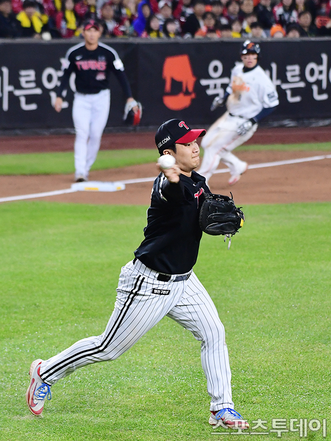 [´ëÀü=½ºÆ÷Ã÷Åõµ¥ÀÌ ±Ç±¤ÀÏ ±âÀÚ] 2025 ½ÅÇÑÀºÇà SOL Bank KBO¸®±× Çѱ¹½Ã¸®Áî 4Â÷Àü LGÆ®À©½º¿Í ÇÑÈ À̱۽ºÀÇ °æ±â°¡ 30ÀÏ ´ëÀüÇÑÈ»ý¸í º¼ÆÄÅ©¿¡¼ ¿·È´Ù. LG ¹®º¸°æÀÌ 4ȸ¸» ¹øÆ® Ÿ±¸¸¦ Àâ¾Æ 1·ç ¼Û±¸¸¦ Çϰí ÀÖ´Ù. 2025.10.30.