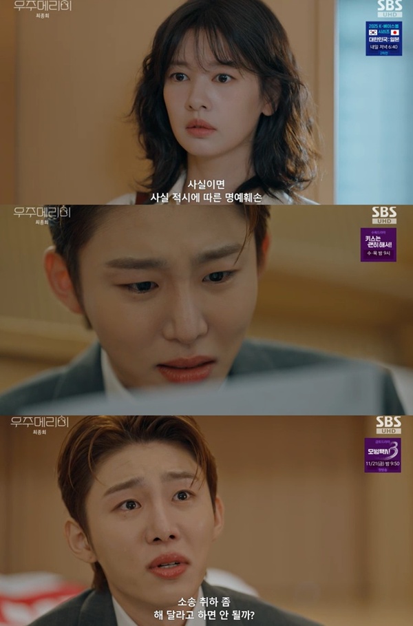 15ÀÏ ¹æ¼ÛµÈ SBS ±ÝÅäµå¶ó¸¶ '¿ìÁÖ¸Þ¸®¹Ì' ÃÖÁ¾È¿¡¼´Â Àü ±è¿ìÁÖ(¼¹üÁØ)ÀÌ À¯¸Þ¸®(Á¤¼Ò¹Î) ¾Õ¿¡¼ ´«¹°À» Èê·È´Ù.