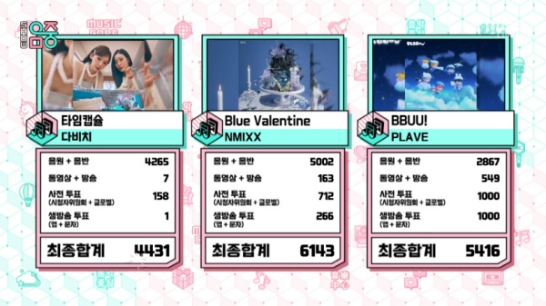 22ÀÏ ¹æ¼ÛµÈ MBC '¼î! À½¾ÇÁß½É' 1À§ Èĺ¸¿¡´Â ´ÙºñÄ¡ 'ŸÀÓĸ½¶', ¿£¹Í½º 'ºí·ç ¹ë·±Å¸ÀÎ'(Blue Valentine), Ç÷¹À̺ê '»Ñ¿ì!'(BBUU!)°¡ ¿Ã¶ú´Ù.