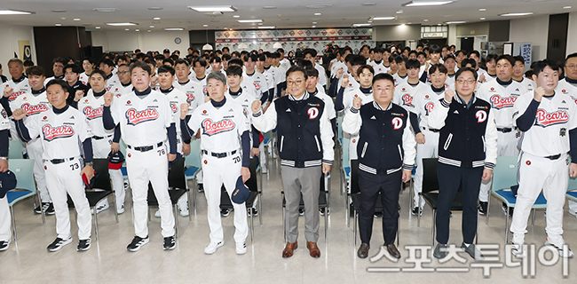 [½ºÆ÷Ã÷Åõµ¥ÀÌ ±Ç±¤ÀÏ ±âÀÚ] 15ÀÏ ¼¿ï Àá½Ç¾ß±¸Àå¿¡¼ ¿¸° µÎ»ê º£¾î½º ½Ã¹«½Ä¿¡¼ °í¿µ¼· ´ëÇ¥ÀÌ»ç, ±èÅÂ·æ ´ÜÀå, ±è¿øÇü °¨µ¶ ¹× µÎ»ê ¼±¼ö´ÜÀÌ ÆÄÀÌÆÃÀ» ¿ÜÄ¡°í ÀÖ´Ù. 2026.01.15.