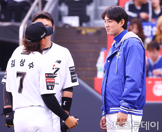 [¼ö¿ø=½ºÆ÷Ã÷Åõµ¥ÀÌ ÆØÇöÁØ ±âÀÚ] 3ÀÏ ¼ö¿øKTÀ§ÁîÆÄÅ©¿¡¼ ¿¸° 2026 KBO¸®±× »ï¼º ¶óÀÌ¿ÂÁî¿Í KT À§ÁîÀÇ °æ±â¸¦ ¾ÕµÎ°í »ï¼º ±¸ÀÚ¿íÀÌ KT ±è»ó¼ö¿Í À̾߱⸦ Çϰí ÀÖ´Ù. 2026.04.03.